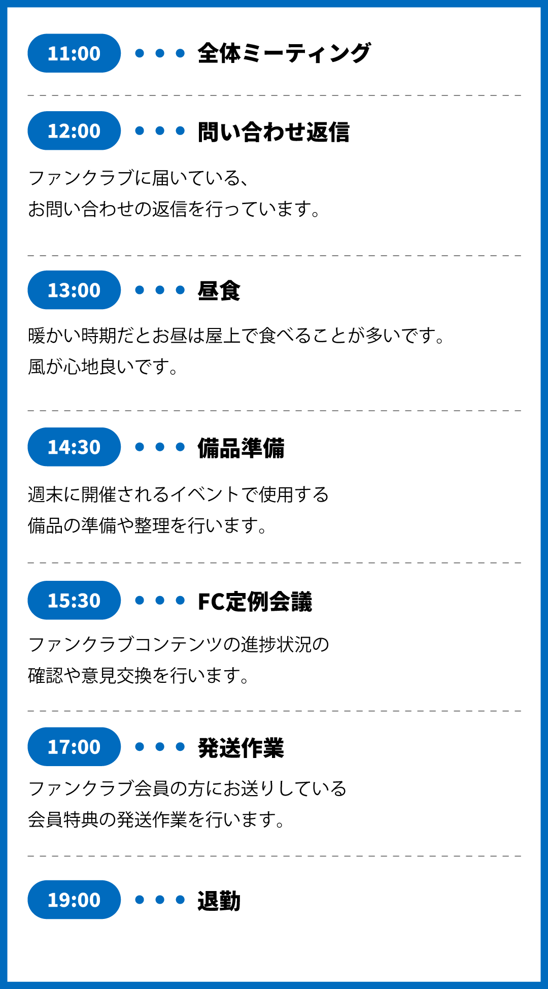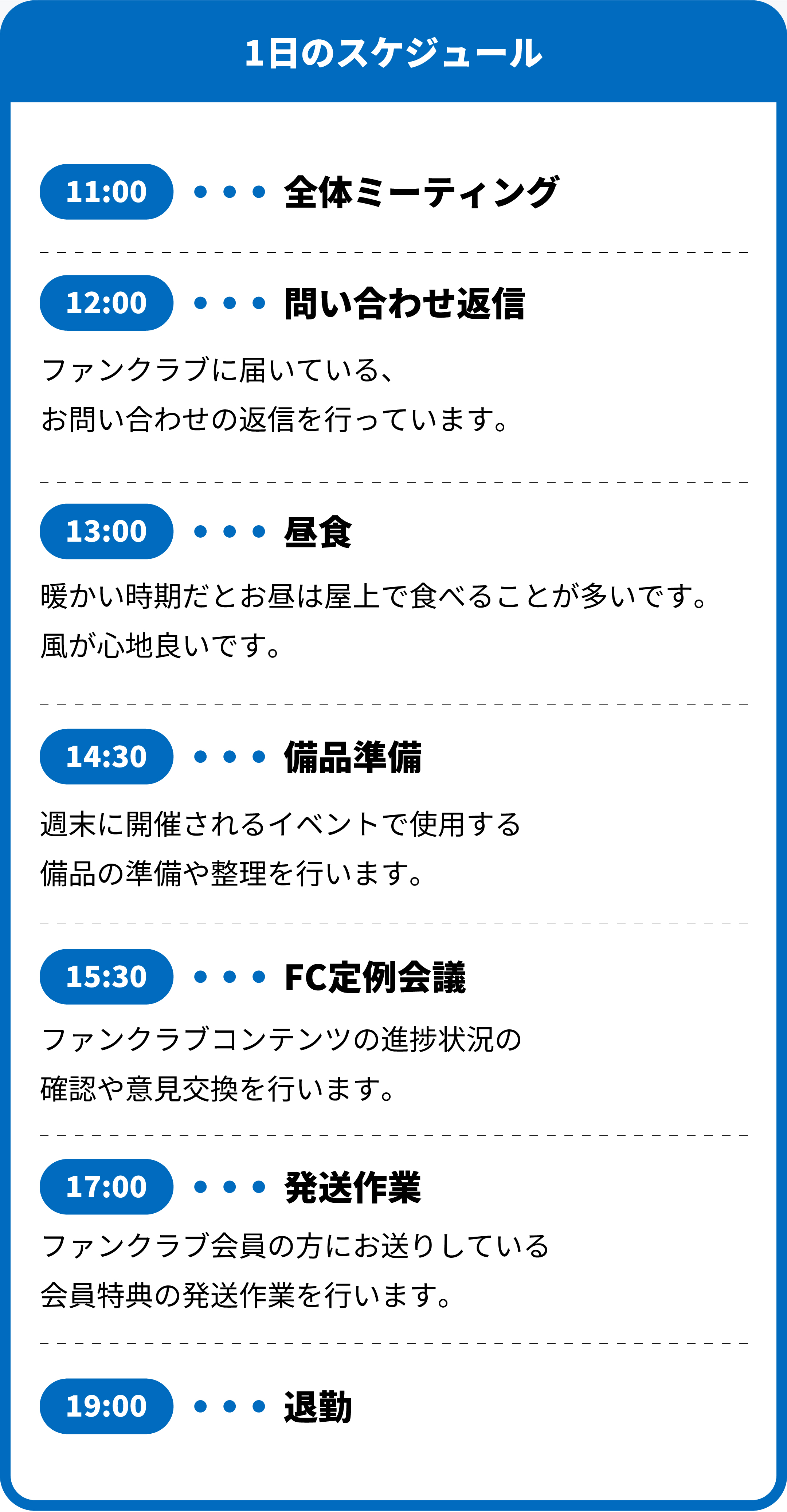 コンサート会場でお客様から「ありがとう」など感謝の言葉をいただいた時や、会員証など、発送した商品がSNSに掲載されているのを見た時にやりがいを感じます。