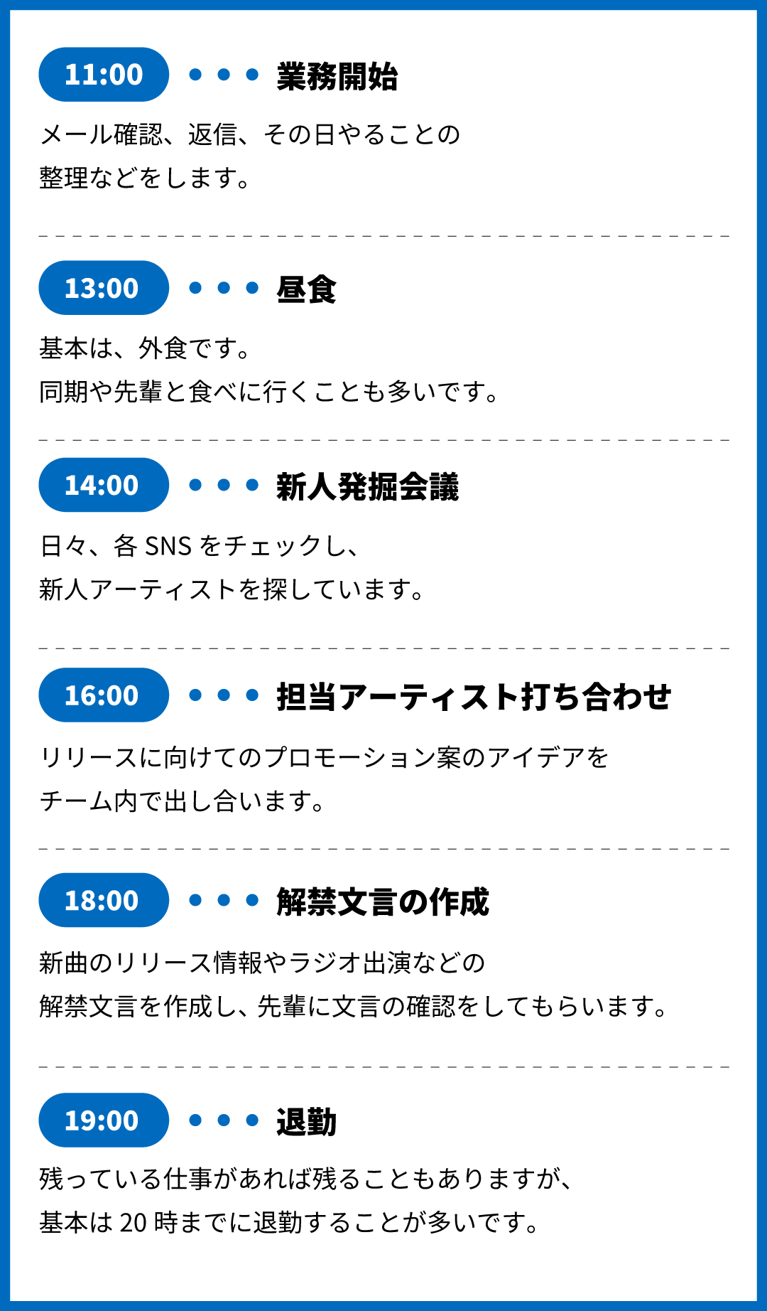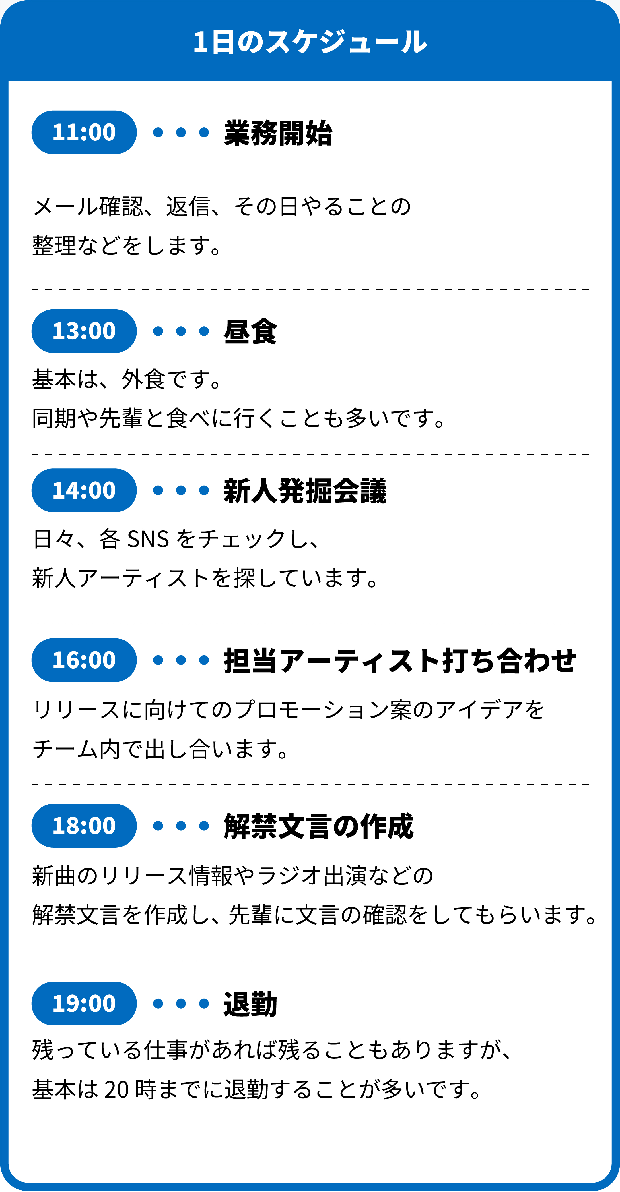 大学生の時に、新人発掘企画に参加し、その経験を通して音楽業界に入りたいと思うようになり、志望しました。